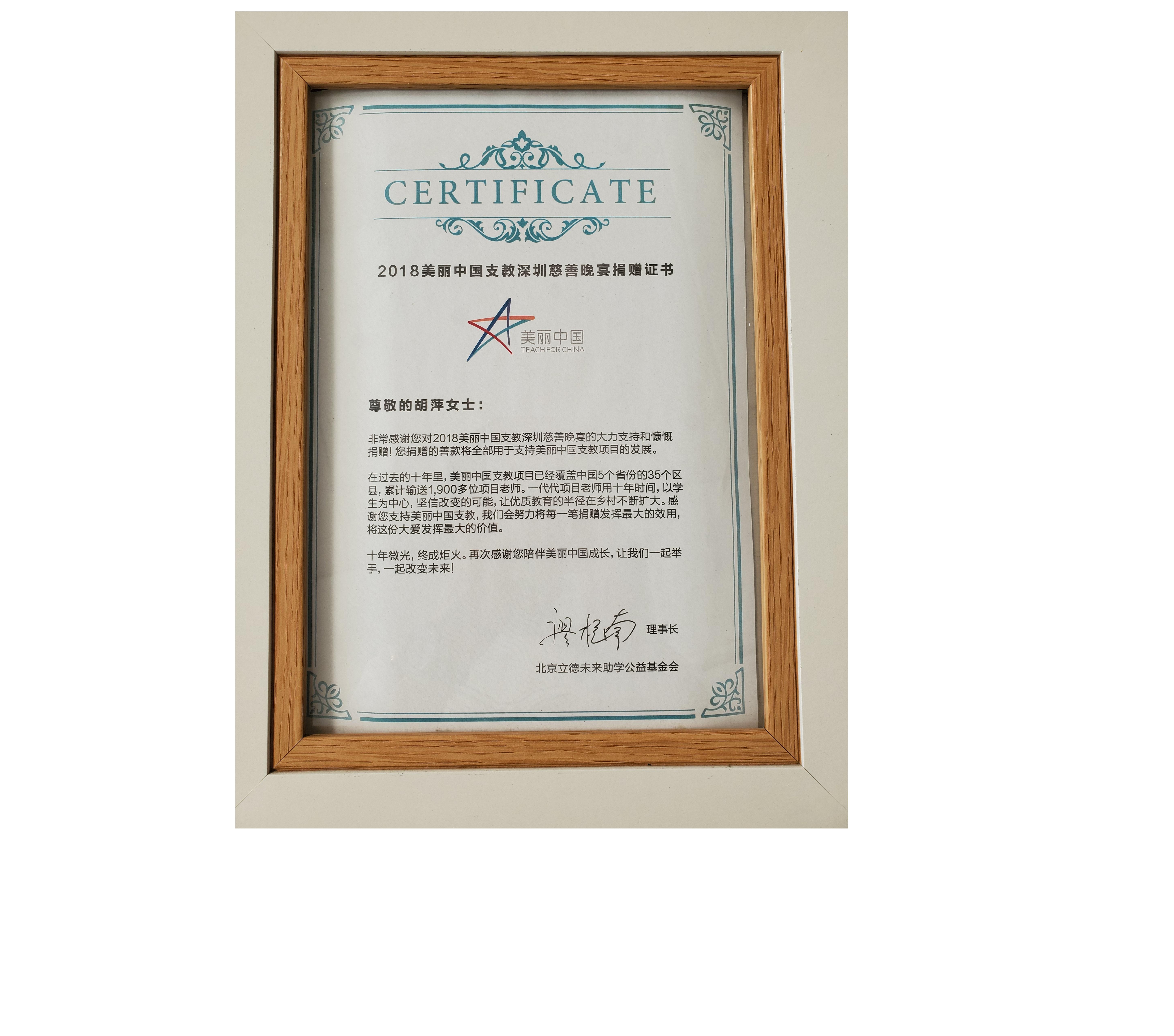 • 美丽中国支教深圳慈善晚宴捐赠证书