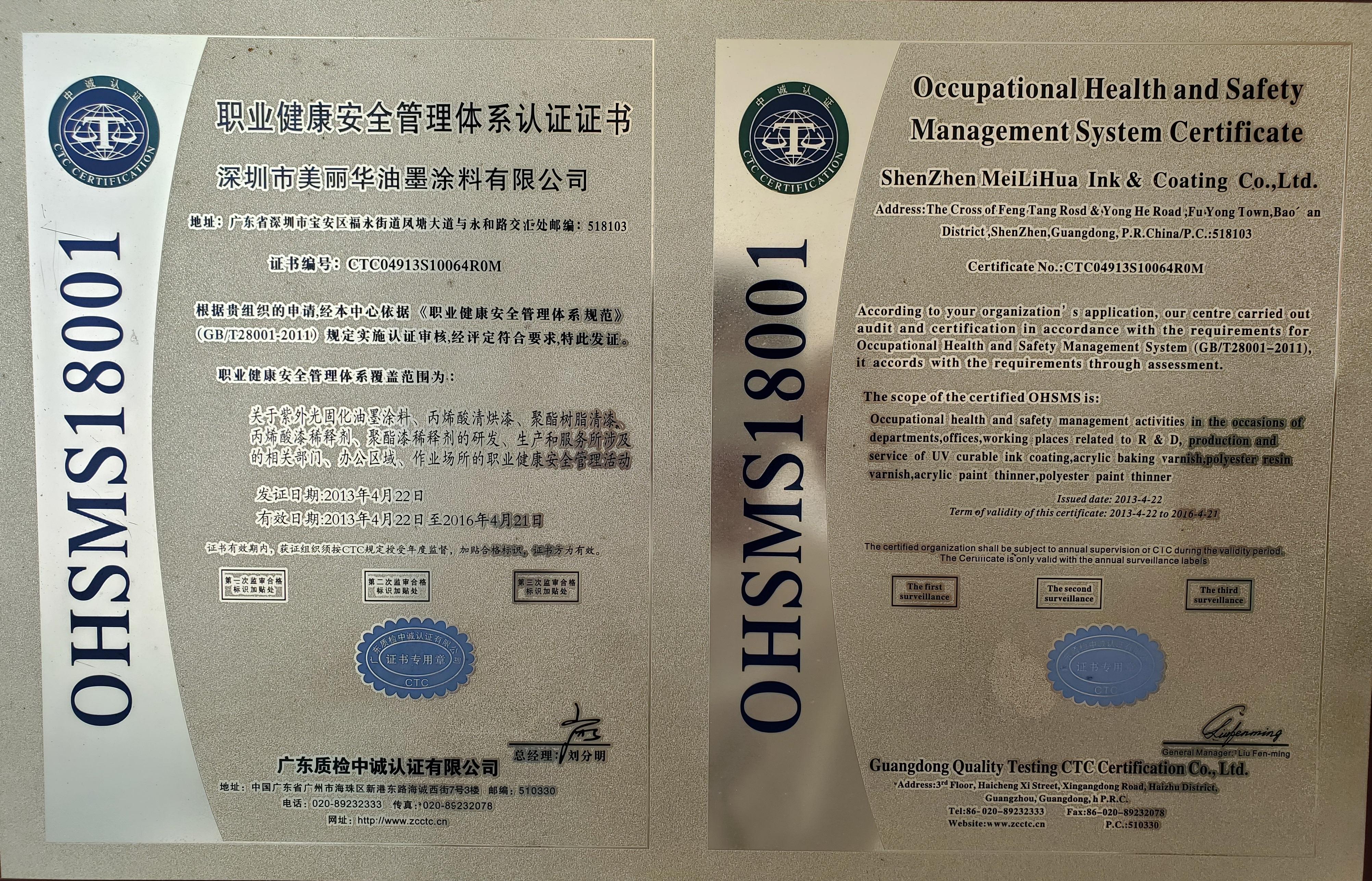• OHSMS18001职业健康安全管理体系认证证书