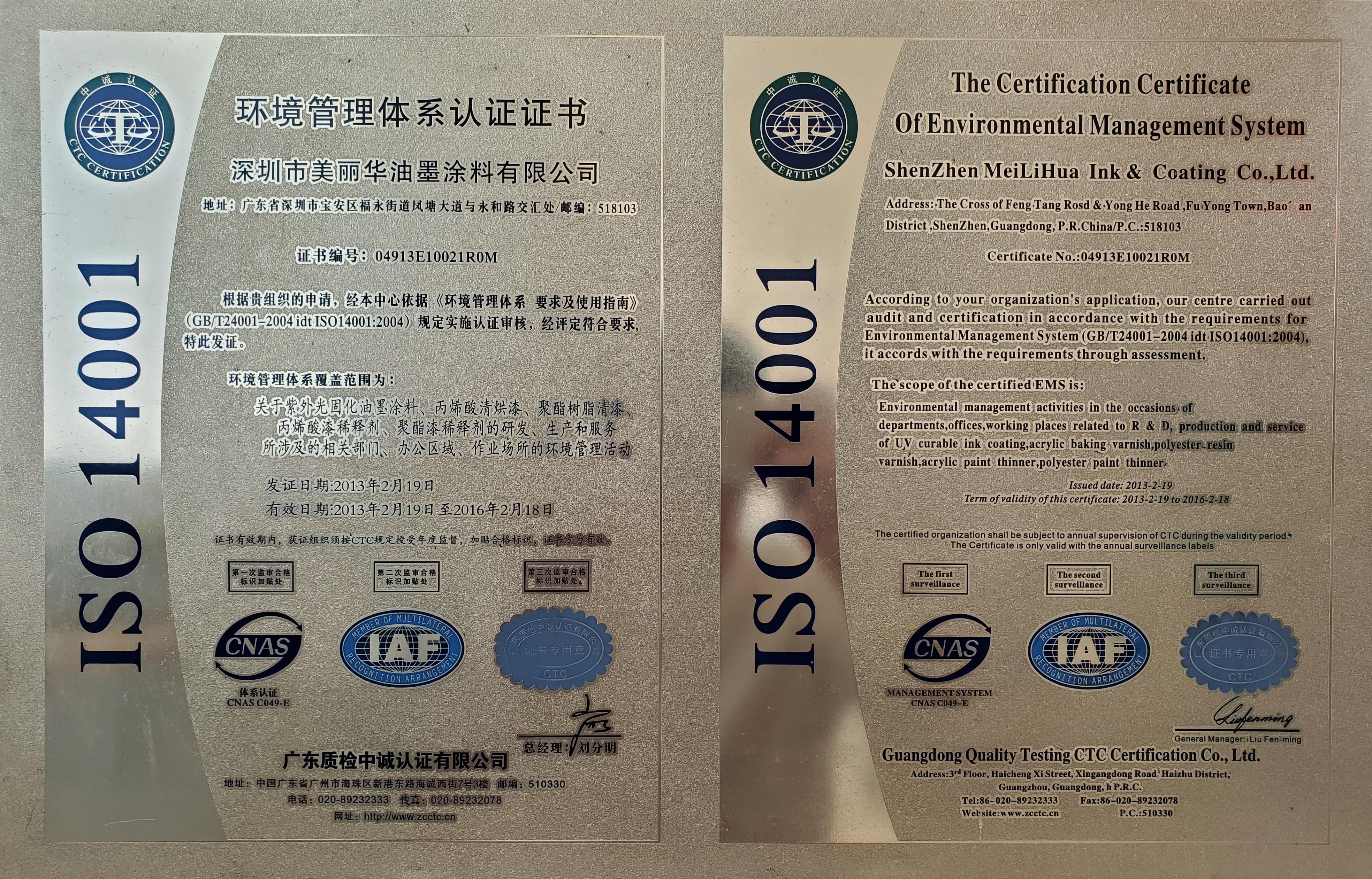 • ISO14001环境管理体系认证证书