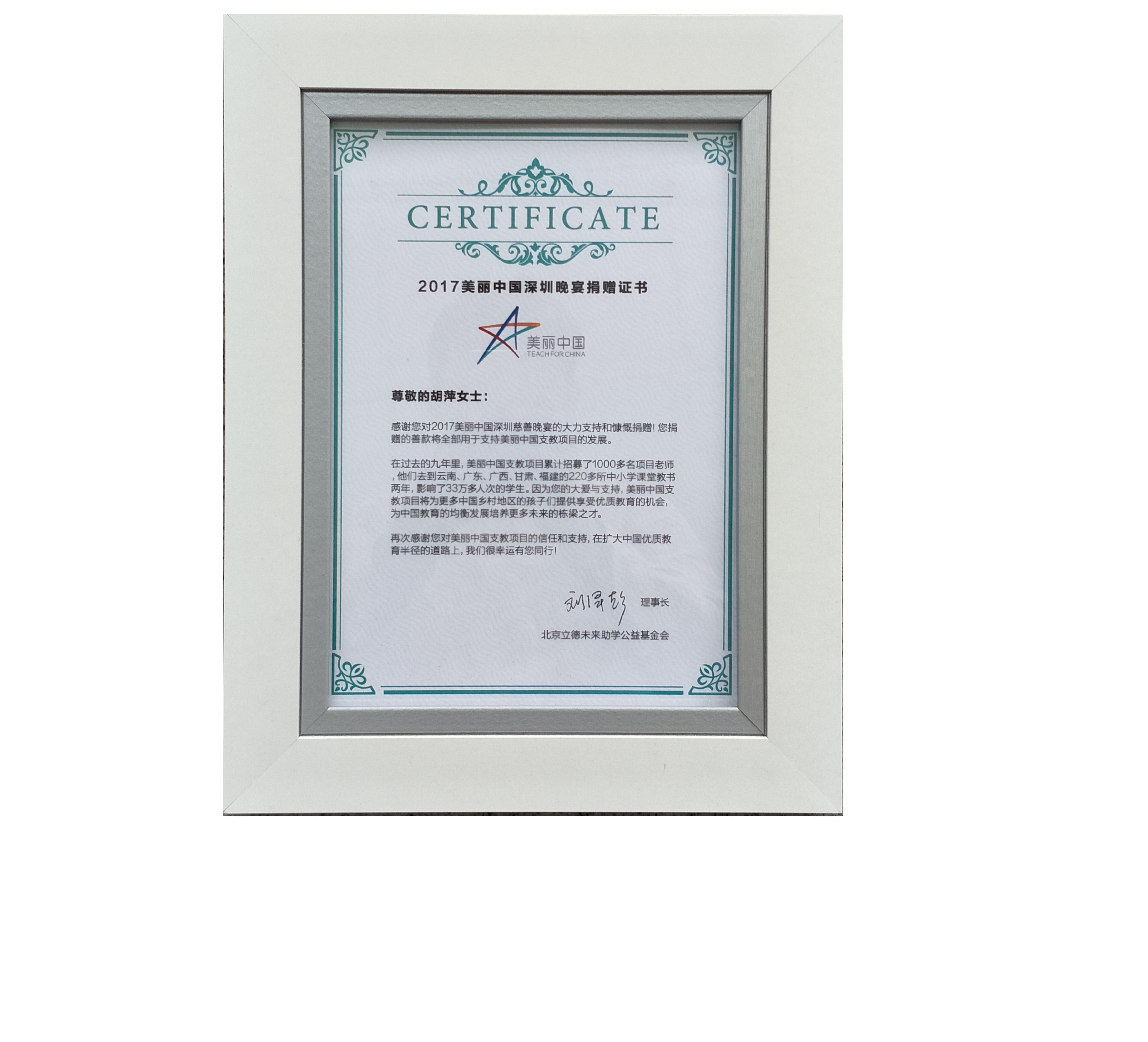 • 美丽中国支教深圳慈善晚宴捐赠证书